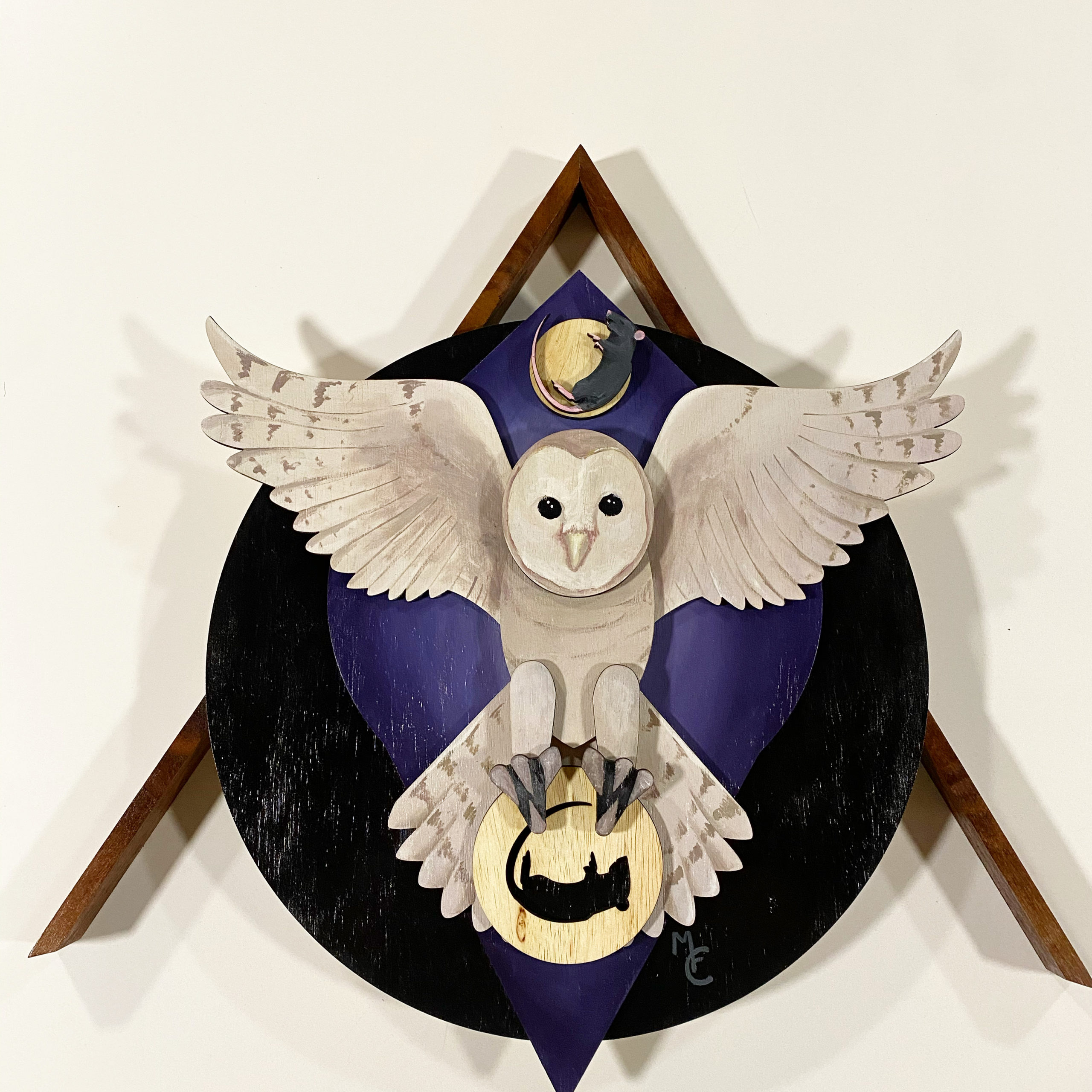 I like to create works that show the relationships of humans and animals. To create my work, I layer pieces of wood, some cut on a laser and some hand cut using a scroll saw. I work on wood as a symbol for nature, and because I’ve always felt a connection with woodworking. My grandfather was a carpenter and my brother builds guitars, which has always drawn me to the idea of working with wood. My color palette is heavily influenced by my love of street art. I started off my career creating brightly colored layered stencils with spray paint. When I moved on from canvas to wood these colors transferred over as a way to show the contrast of man’s influence on the natural look of the wood. We also find symmetry both in nature and human made influences on nature. I incorporate symmetry to show this connection between both the natural and manmade world. My creations depict my understanding of how animals and humans interact with each other. Our relationship has become symbiotic over time, with us taking and animals adapting to their new environment.