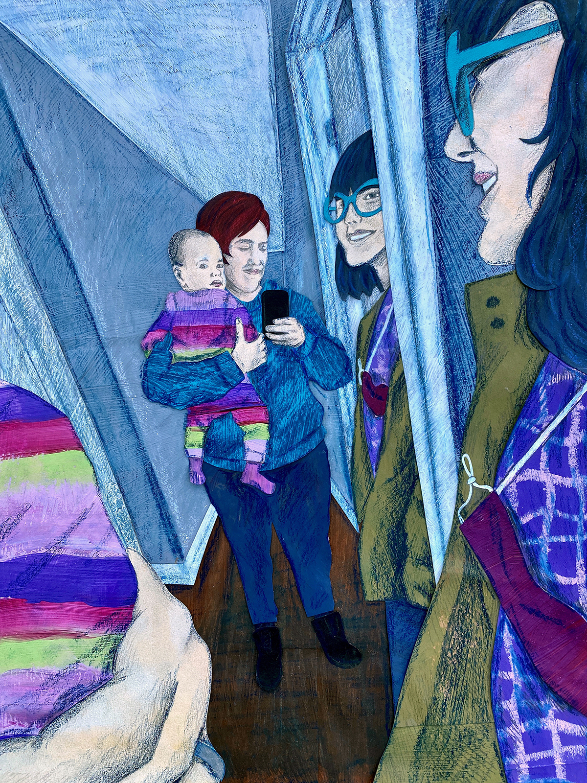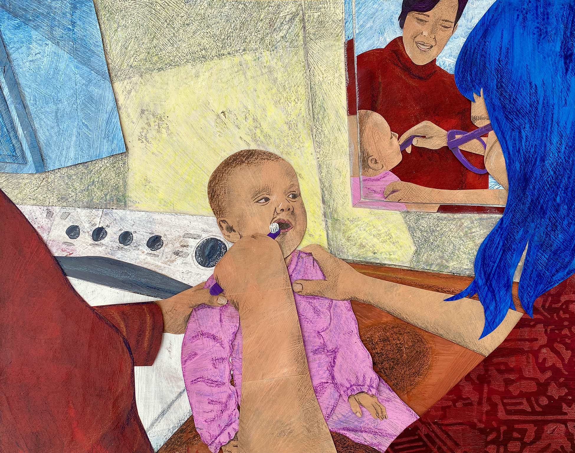 These collages were created as a way of coping with the loss of time, structure, and balance in the last 9 months. Working and teaching from home with a newborn baby and teen, time has lost meaning and the days blend together. My daughters are inspiration, collaborators, and occasionally saboteurs as I create images and narratives.